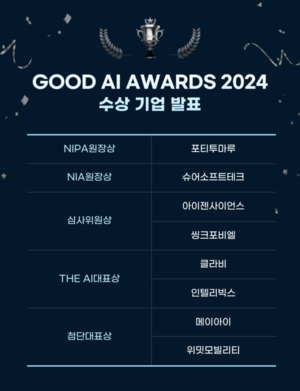 인공지능(AI) 기술과 안전성을 모두 평가하는 국내 유일 시상식이 24일 경기도 고양시 킨텍스에서 열렸다. 이날 시상식에선 기술력 향상과 안전성 확보에 앞장선 기업 8곳이 선발됐다. 심사 점수 기준으로 △포티투마루 △슈어소프트테크 △아이젠사이언스 △씽크포비엘 △클라비 △인텔리빅스 △메이아이 △위밋모빌리티였다.올해로 3회쨰를 맞이한 Good AI Awards는 기술력과 안전성 등 ‘좋은(Good) AI’ 조건을 평가해 시상하는 시상식이다. 인공지능 전문매체 더에이아이(THE AI)가 AI 개발과 상용화에 있어 우수한 성능과 안전성을