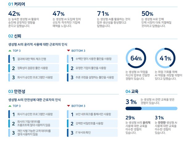 응답자들은 생성형 AI 기술의 높은 영향력에도 불구하고 신뢰성과 안전성 측면에서 위험 요소가 있다는 데 동의했다. 직장 내 생성형 AI 사용자 중 55%는 공식적으로 승인되지 않은 생성형 AI 기술을 사용한 경험이 있는 것으로 확인됐다. 사용자의 64%가 생성형 AI로 도출한 작업물을 자신의 창작물로 활용한 경험이 있다고 응답했다. 취업을 위해 본인의 생성형 AI 활용 능력을 과장할 의향이 있다고 응답한 비율도 41%였다.