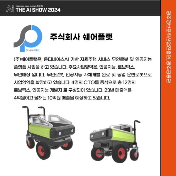 쉐어플랫이 오는 10월 23일부터 25일까지 일산 킨텍스에서 열리는 ‘THE AI SHOW 2024(TAS 2024)’에서 자율주행 과수농가 추종형 운반 로봇 ‘무브봇(Move Bot)’을 선보인다. 이번 전시에서 공개될 무브봇은 인공지능(AI) 알고리즘과 3D 카메라를 활용해 농경지 및 과수원에서 자율주행이 가능하도록 했다.