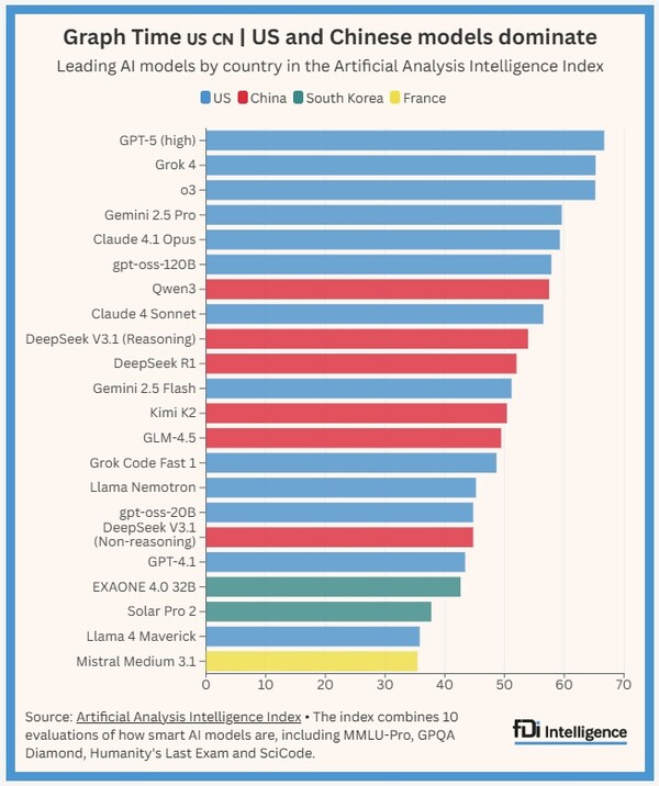 미칼 힐스미스 아티피셜 애널리시스 최고경영자(CEO)는 “최신 AI 모델과 경쟁하며 지속적으로 개선하는 것은 어려운 일”이라며 “미국과 중국에서 각각 최소 10개 기업이 이 분야에서 경쟁하고 있는 반면, 다른 모든 국가를 합쳐도 몇 개에 불과하다”고 말했다.