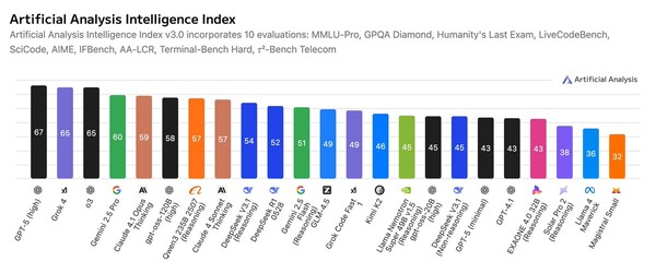 아티피셜 애널리시스는 영국에 기반을 둔 AI 모델 성능 평가 전문기업이다. 전 세계 주요 LLM들의 성능을 객관적으로 비교 분석하는 독립적인 벤치마킹 서비스를 제공하고 있다. 수학, 과학, 코딩 등 10개 분야에서 모델들의 지능 지수를 평가한다.